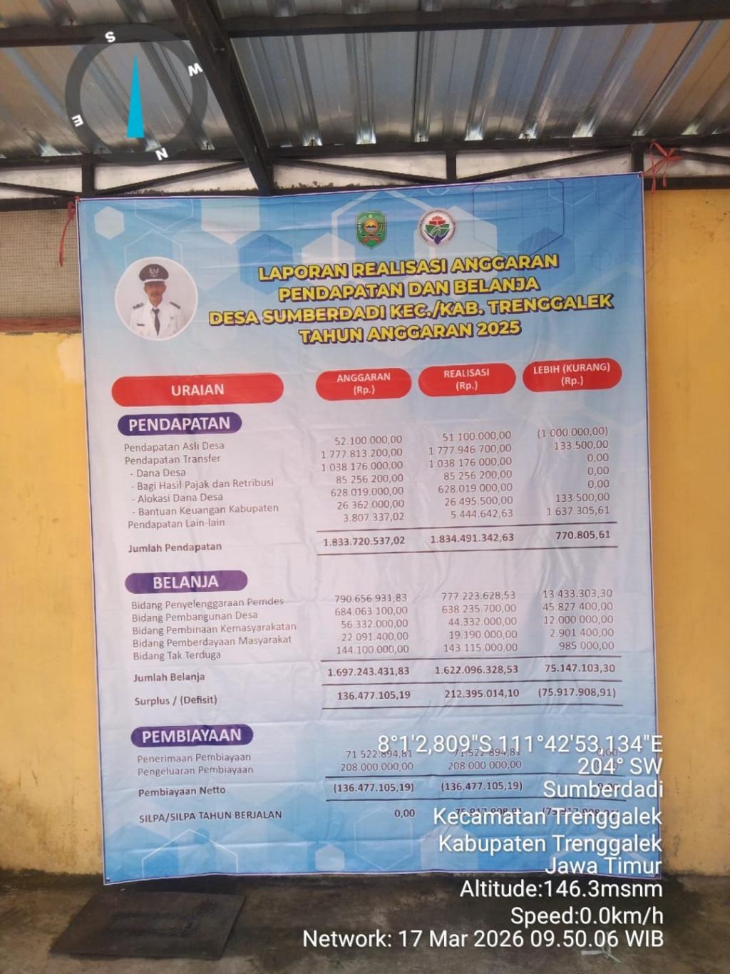 Sebagai Wujud Transparansi Realisasi Anggaran Pendapatan dan Belanja Desa Sumberdadi Tahun Anggaran 2025, Pemerintah Desa Sumberdadi Kecamatan Trenggalek Kabupaten Trenggalek Menyampaikan Info Grafis Realisasi Anggaran Pendapatan dan Belanja Desa Sumberdadi Tahun Anggaran 2025 yang dipasang ditempat strategis yang mudah diakses/dibaca.